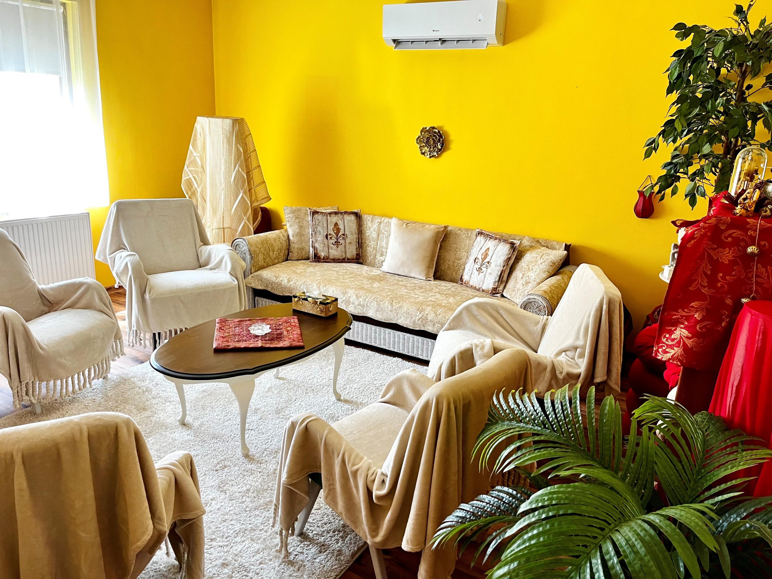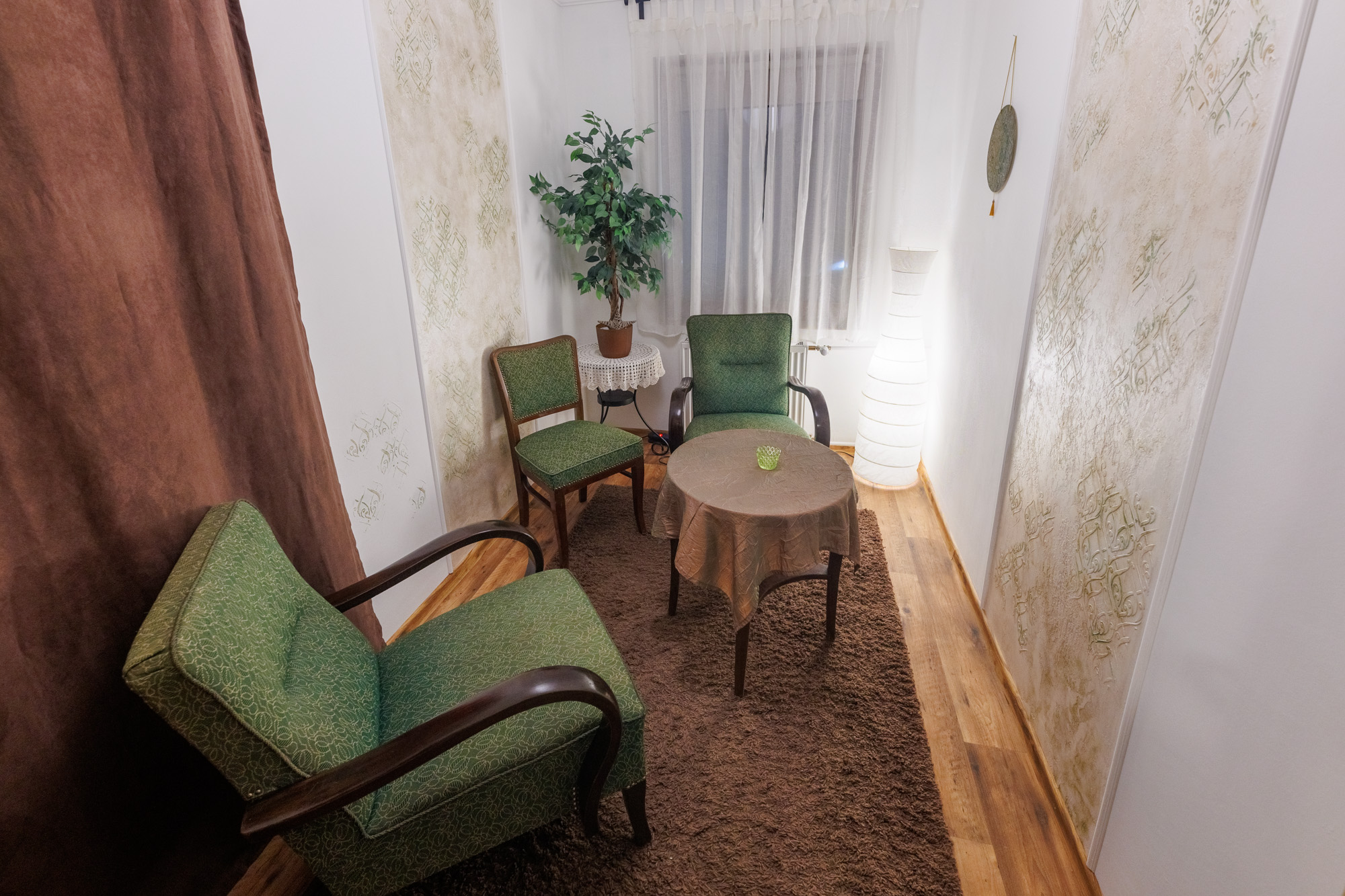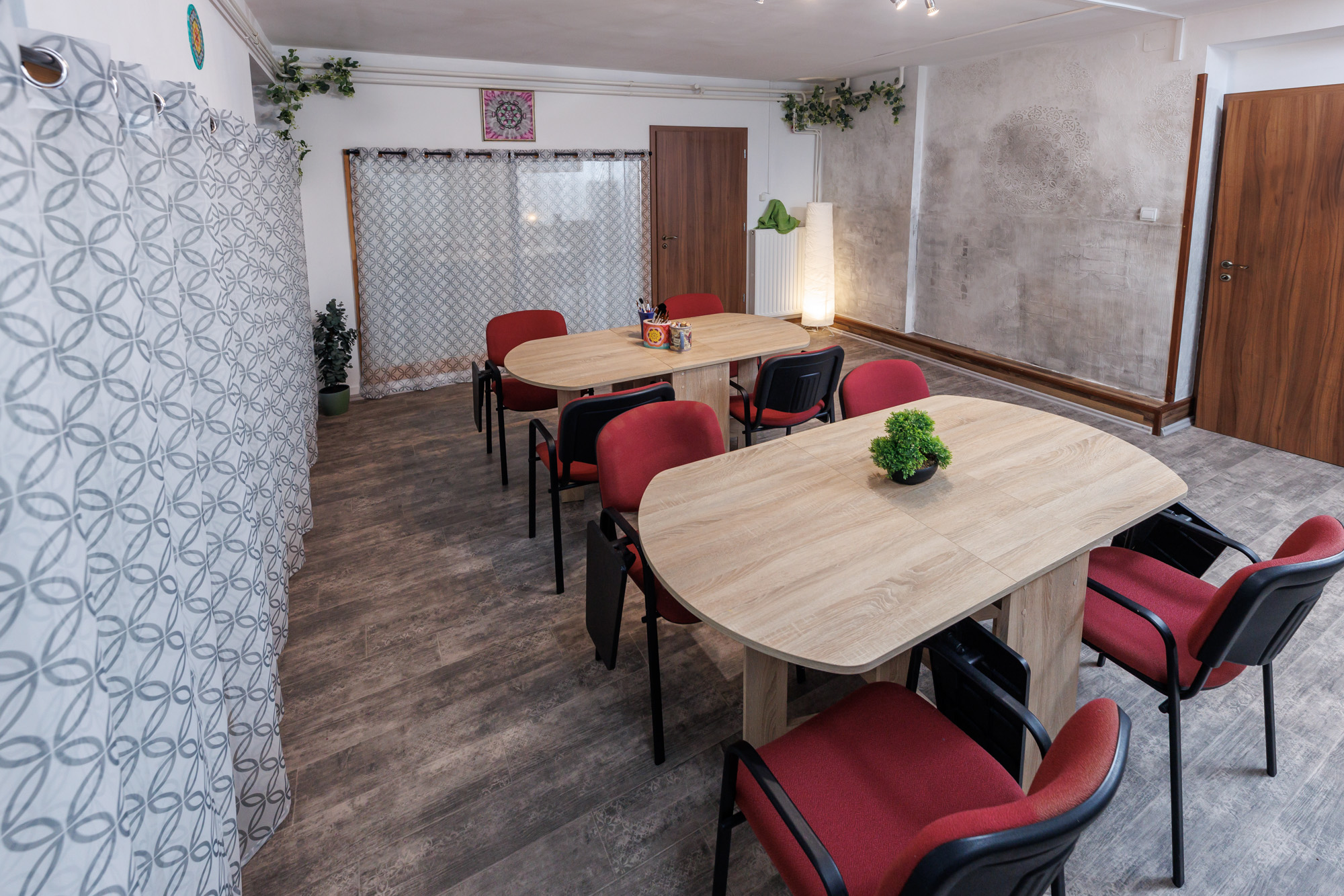 Az emeleten található 28 m2-es klimatizált szoba, 6 fotellel, kanapéval, jógapárnákkal, kiscsoportos tevékenységekre alkalmas, 10 főig (női körök, tanfolyamok, kiscsoportos előadások, párterápiák…)