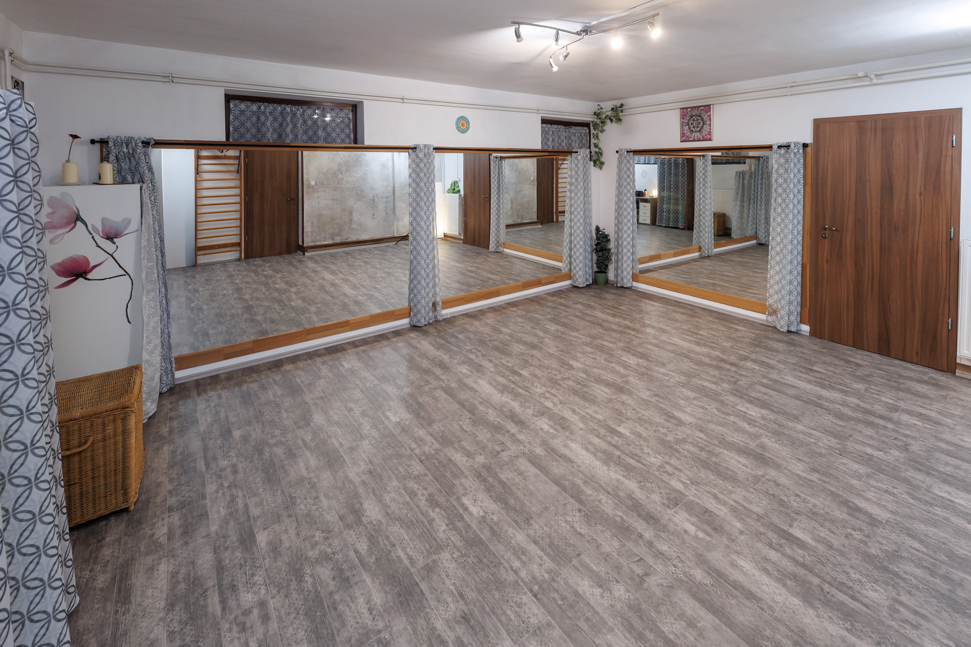 Az alsó szinten található 28 m2-es terem, gyermek és felnőtt jógaórákra, gyógytornára, kreatív tanfolyamokra, előadásokra, tréningekre és táncoktatásra alkalmas tükrös terem (függönnyel takarható tükrök)
